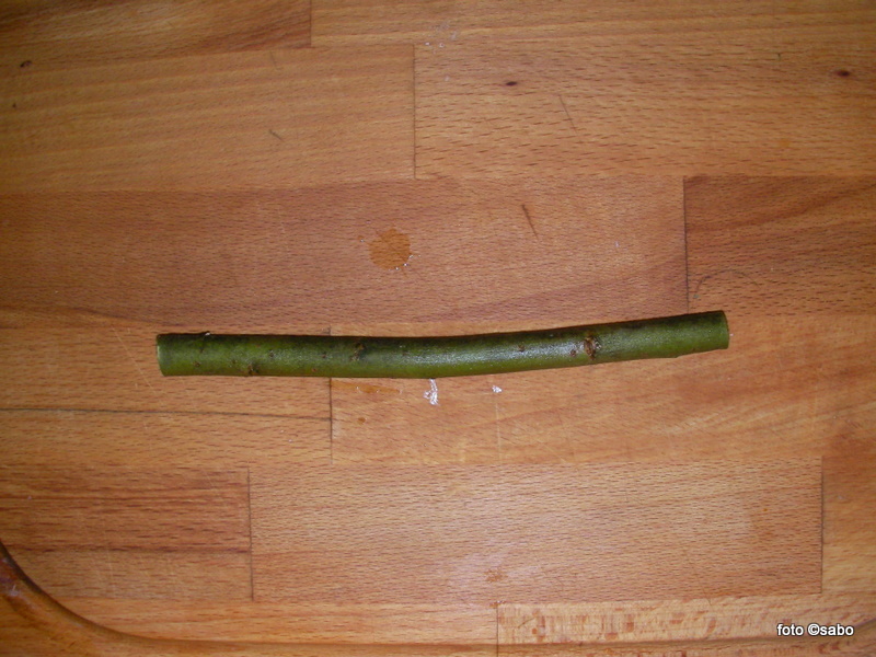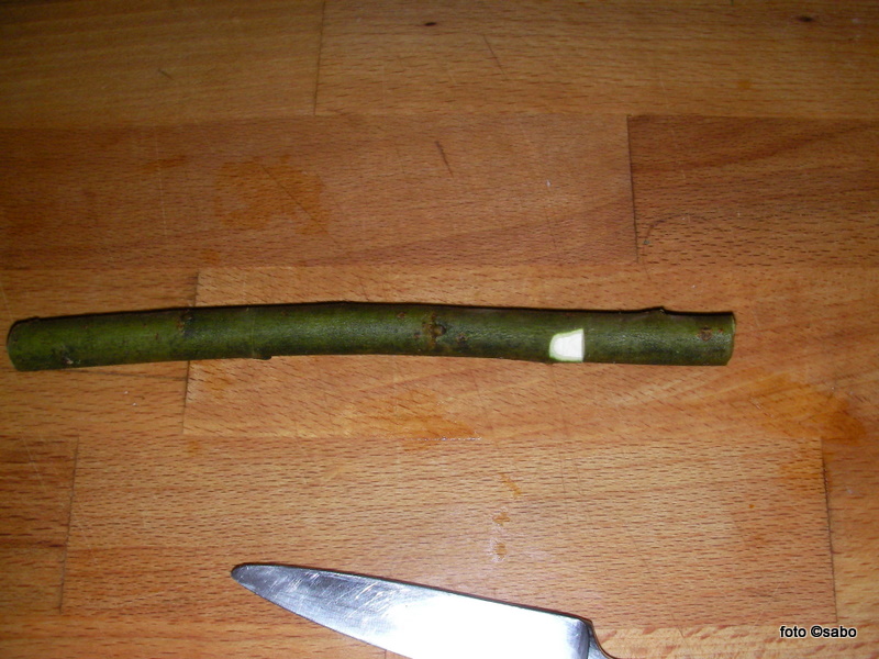 Wenn man einen etwa zwei Finger langen und möglichst fingerstarken jungen Ast findet, der möglichst gerade ist und gleichbleibende Dicke hat, dann schneidet man diesen großzügig von der Pflanze ab.