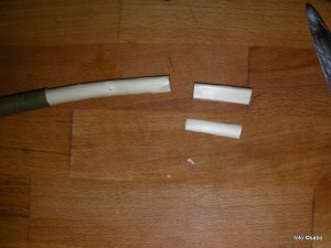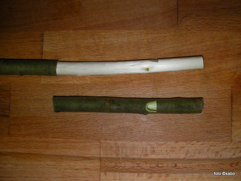 Für das Luftloch am Mundstück schneidet man eine Kerbe mit zwei Schnitten. Der erste Schnitt wird gerade, etwa 1,5 – 2 cm vom Ende entfernt, angebracht. Er sollte 4-5 mm tief sein. Den zweiten Schnitt lässt man flach darauf zulaufen (soll heißen, man schneidet einen kleinen Keil aus dem Stab)