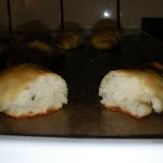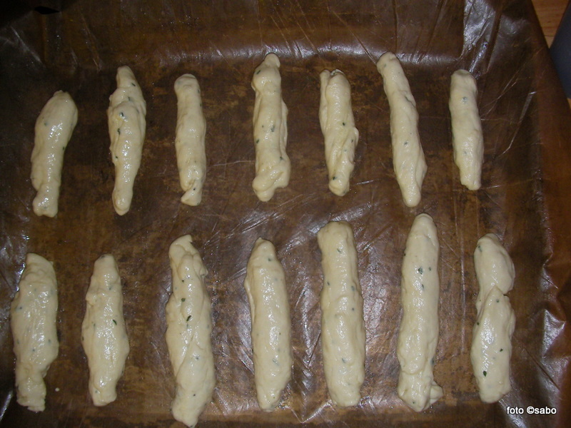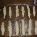 Diese Portionen in kleine ca. tischtennisballgroße Portionen weiter unterteilen, Würstchen rollen, die in etwa 10 cm lang sind. Das ganze ist eine etwas rutschige Angelegenheit wegen des Öls und außerdem hat Hefeteig ja die fiese Angewohnheit, gerne in seinen Ursprünglichen Zustand zurückschnippen zu wollen. Aber mit etwas Überredungskunst gelang es mir, die Teile einigermaßen auf dem Backblech zum Liegen zu bekommen.
