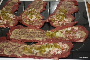 Die Rouladen wie üblich mit Salz und Pfeffer würzen, mit Senf bestreichen und dann belegen.