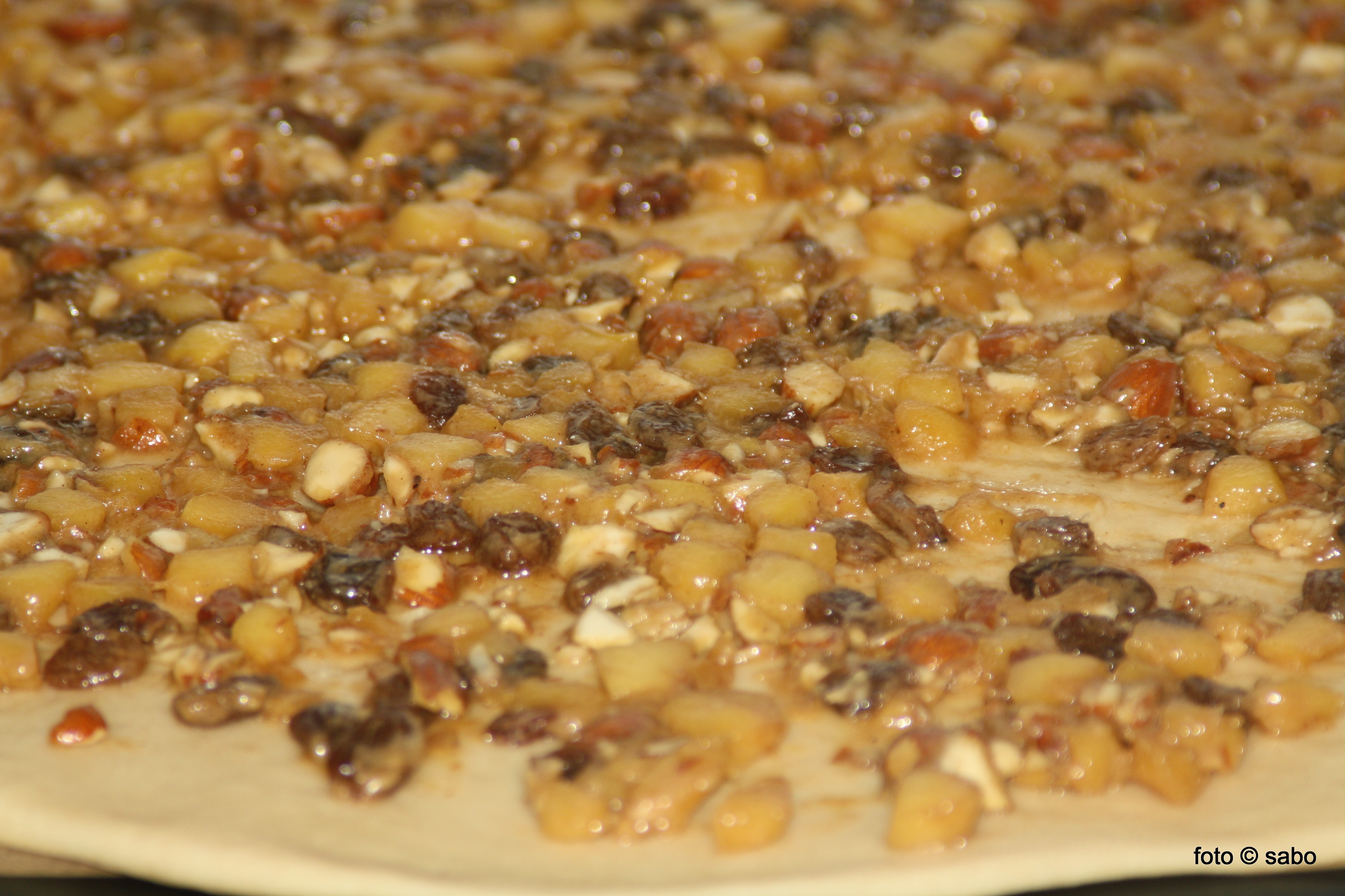Auf den ausgerollten Teig dann die Fülle augestrichen