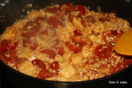 Die Zutaten habe ich nach ca. 3 Minuten anbraten (also der Reis war zu der Zeit gut 3 Minuten in der Pfanne) einmal gut durchgemischt und mit dem Safransud aufgegossen.