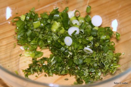 Die habe ich gewaschen, klein geschnitten und mit der Frühlingszwiebel schon mal in die Schüssel gegeben.