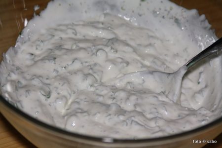 - Kräuter mit Schmand, Joghurt, Salz und Pfeffer verrühren