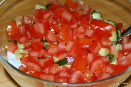 Nachdem ich die Salatgurke und die Tomaten entkernt und gewürfelt hatte, habe ich feststellen müssen, dass die Schüssel zwar die Menge fassen wird, ich dann aber nicht mehr umrühren kann. Blöd!