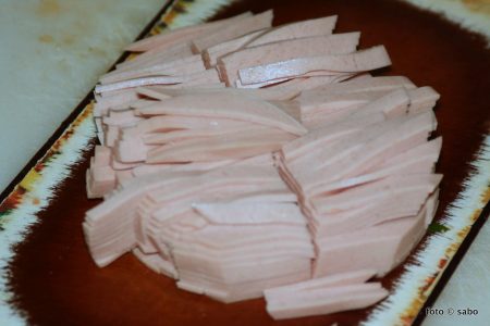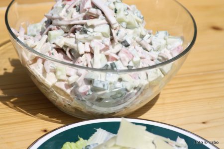 Also war Umfüllen in eine andere Schüssel angesagt. Zu dem Salat kamen noch in Streifen geschnittene Geflügelsalami